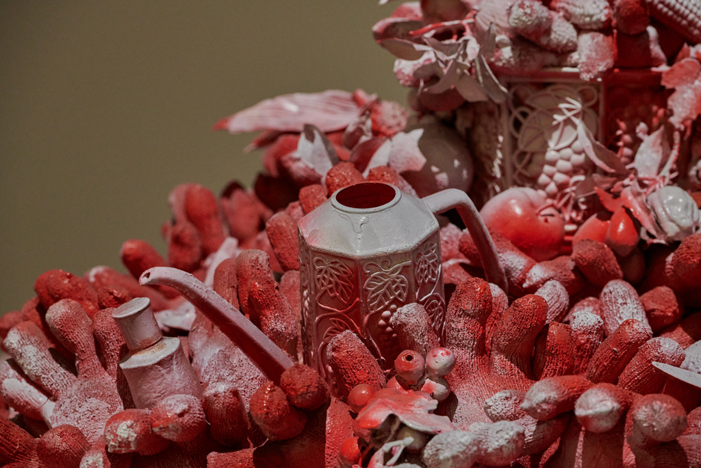 The End of Summer consists of a table and two chairs, which are completely covered with stuffed knitted work gloves. These objects protrude from the seats of the chairs and the table top and seem to reach out towards the viewers like greedy hands. Enthroned in the middle of the table is an assemblage of everyday objects made of plastic, including two baskets filled with fruit and vegetables, the opulence of which is reminiscent of a baroque centerpiece. The installation space is completely painted in red and white, so that the boundaries between the individual objects seem to dissolve.